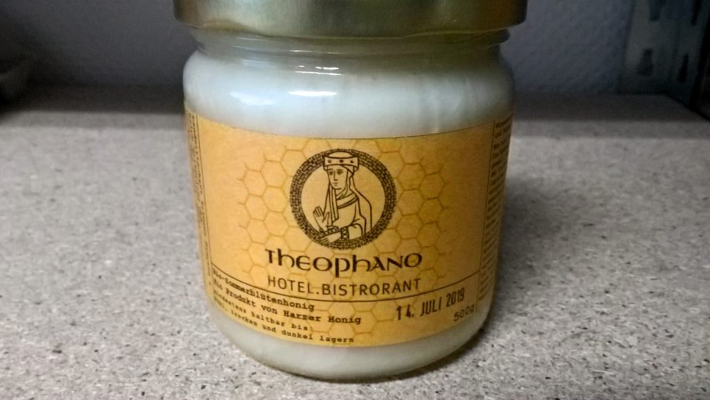 Der Küchenchef des Hotels legt großen Wert auf Produkte regionaler Herkunft. Deswegen ist Harzer Honig ab sofort auf dem Frühstücksbuffet zu finden. Wir haben uns bedankt mit einem Etikett, das mit der edlen Namensgeberin bedruckt ist.