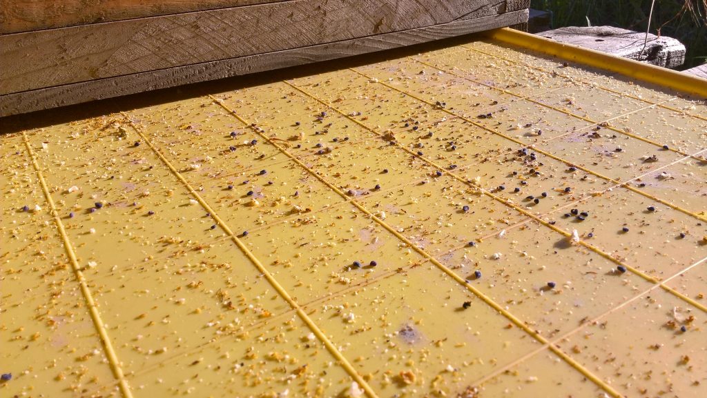 Mit voranschreiten des Jahres gilt es ein Auge auf die Entwicklung der Varroapopulation im Bienenvolk zu werfen. Wir verwenden dazu Schieber, die am Boden der Beuten eingelegt werden können. Nach 24 oder 48 h werden sie wieder entfernt. Im sogenannten Gemüll werden dann die gefallenen Varroamilben nachgezählt. Anhand der gefallenen Milben kann auf den Varroabefall im Volk geschlossen werden. Bei uns sieht es bisher noch sehr gut aus. Auf dem Schieber war keine Milbe zu finden. An stattdessen konnten wir vom lila Phazeliapollen naschen. Ein überaus gesunder Genuss!