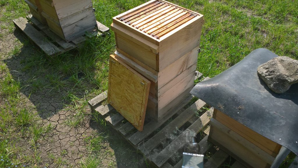 5. Und schon steht der Honigraum auf dem Volk. Bevor der Honigraum aufgesetzt wird müssen Reste vom Winterfutter entnommen werden, sonst würde dieses Futter im frischen Honig landen. Wir entfernen das alte Winterfutter sobald die Bienen genug Möglichkeiten haben sich mit frischem Honig und Pollen zu versorgen.